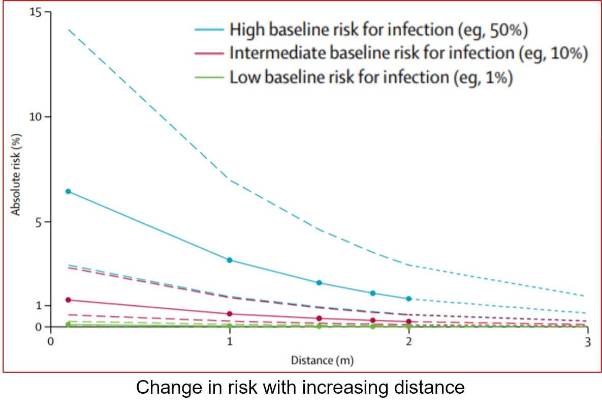 But take a look at the red and green lines on the graph, which show what happens to your risk of infection once your baseline risk is either intermediate (red) or low (green). In either situation, moving from 1m of distancing (about 3 feet) to 2m of distancing (about 6 feet) barely changes your risk at all.
